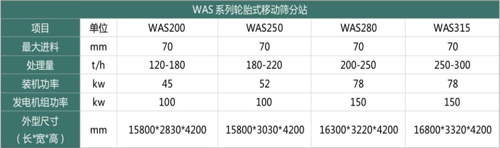 WAS系列轮胎式移动筛分站技术参数