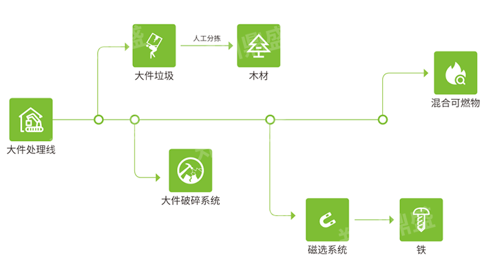 大件垃圾处理系统通过破碎、磁选、筛分、除尘等工艺流程,可以高效分选出大件垃圾中的织物、海绵、木材、铁磁料等物料,可通过“破碎+分选”工艺快速实现对大件垃圾的减容和初步资源化处理,降低存放和运输成本。也可以通过“多级破碎+多级分选”工艺实现对大件垃圾自动分类处理,资源化利用程度高,而且更适合混合型大件垃圾的处理。