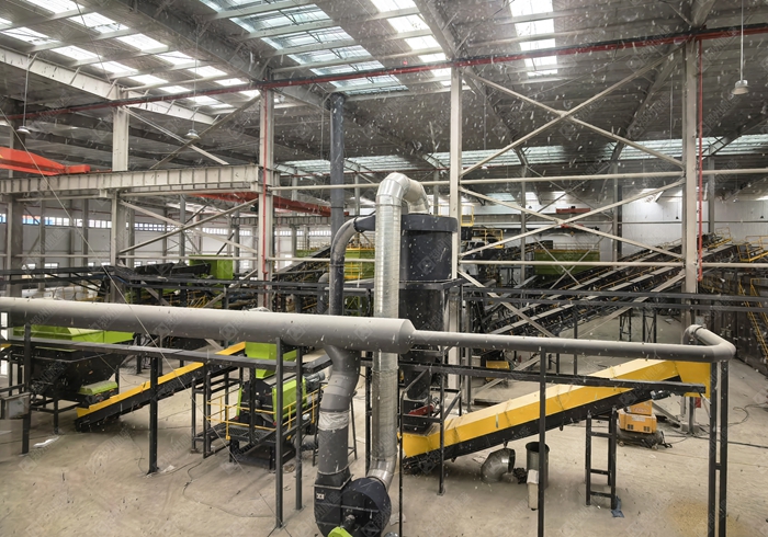 核心设备:破碎机(颚式 + 反击式)、筛分机(振动筛 / 滚筒筛)、分选设备(磁选机、涡电流分选机、风选机)、输送机、水洗系统(若有)、环保设备(除尘、降噪、污水处理)。