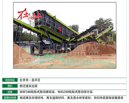 北京·石景山区—建筑垃圾原地利用 2018年初,北京石泰基础设施投资有限公司从郑州鼎盛公司订购了一套轮胎式建筑垃圾处理设备,用于对石景山区建筑垃圾进行就地资源化利用。投产后,每天的处理量可达2340吨,经处置得到0-5mm,5-20mm,20-40mm等规格成品骨料。建筑垃圾综合处置及资源化过程中,可根据建设需求生产多种资源化产品,应用于房地产开发及市政建设工程中。