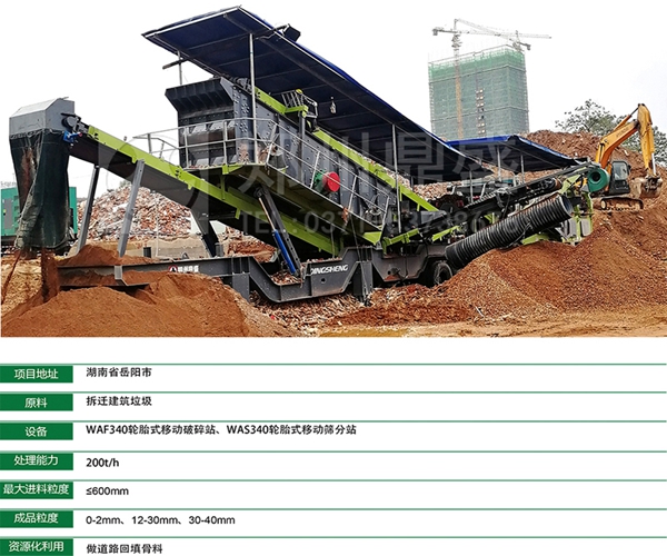 湖南岳阳客户现场使用的这台WAF340轮胎式移动破碎站,是郑州鼎盛公司在原有WAF系列移动破碎站基础上,吸收引进行业各种技术,并结合我国建筑垃圾处置现状,对破碎机腔型及内部构造进行改良升级后的新一代移动破碎站,与老款设备相比,产能更高、能耗更低、板锤重量更轻更换也更为方便,目前设备已经在多个项目中投入使用,性能稳定、维护方便,欢迎新老客户考察、交流!